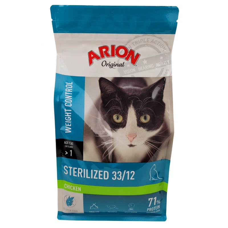 Sterylizacja kota ma liczne zalety. Oprócz wyeliminowania niepożądanych zachowań i niechcianego potomstwa, zapewnia także ochronę przed licznymi nowotworami i zakażeniami układu rozrodczego. Ponieważ sterylizacja powoduje zmiany hormonalne i fizjologiczne w organizmie kota, zmieniają się także potrzeby żywieniowe:koty sterylizowane mają mniejsze zapotrzebowanie na energięi mniejszy poziom aktywności, ale z drugiej strony daje się zauważyć zwiększony apetyt i skłonność do przejadania się. Badania wykazały u kotów sterylizowanych znacznie większe ryzyko nadmiernego wzrostu wagi ciała w porównaniu z kotami niekastrowanymi. ARION Original Sterilized 33/12 łączy w sobie właściwy poziom energii z białek wysokiej jakości z należycie wyważoną ilością włókna, idealnie dla kotów sterylizowanych. Dodatek znaczącej ilości l-karnityny wspiera metabolizm tłuszczów i pomaga zachować idealną wagę. Starannie dobrane naturalne włókna, w tym także pulpa buraczana i babka płesznik, wywołują poczucie sytości, regulują pasaż jelitowy i eliminują pilobezoary (kule włosowe) z przewodu pokarmowego kota. Dzięki temu kot unika uczucia ustawicznego głodu, choć otrzymuje zmniejszoną ilość kalorii. Kontrolowany poziom magnezu w moczu (pH 6,0 - 6,4) zmniejsza ryzyko powstawania kamieni moczowych i wspiera należytą kondycję przewodu moczowego. Skład karmy ARION Original Sterilized 33/12 wzbogacony jest o chondroitynę i glukozaminę, co ułatwia utrzymanie elastycznych i mocnych stawów, oraz zmniejsza ryzyko mechanicznego ich uszkodzenia wskutek nadwagi.