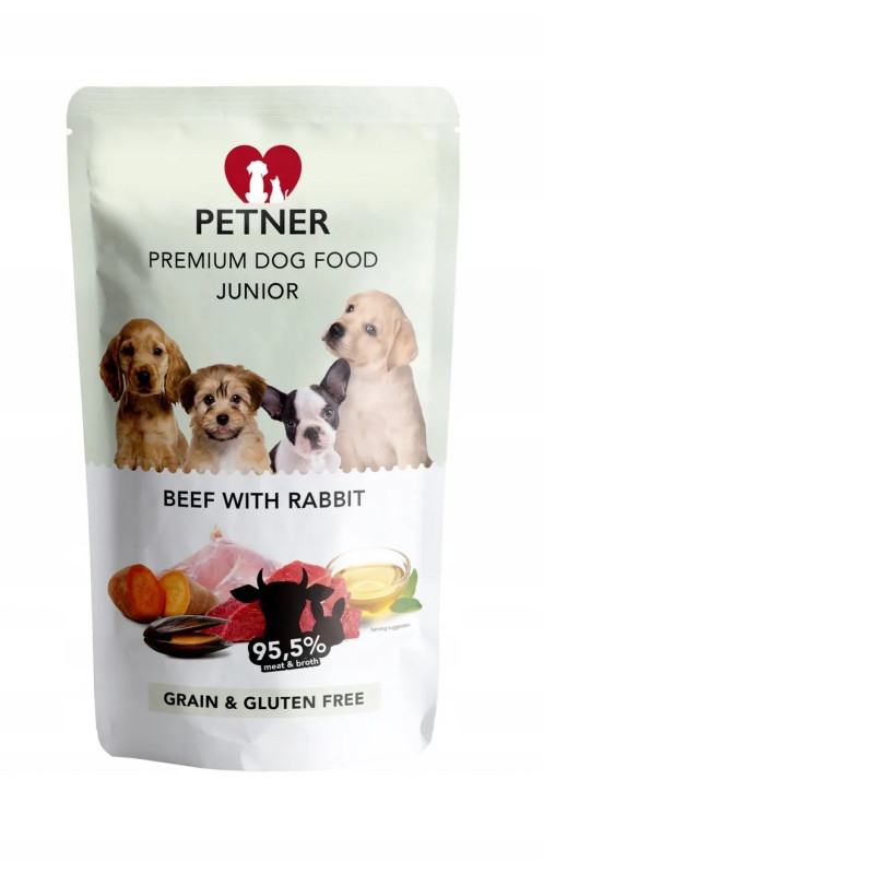 Petner Karma Mokra dla Młodych Psów z Wołowiną i Królikiem – Naturalna i SmacznaPełnoporcjowa karma Petner dla młodych psów to zbilansowany posiłek, który dostarcza wysokiej jakości białka pochodzenia zwierzęcego. Aż 95,5% saszetki stanowi mięso wołowe z królikiem, w aromatycznym bulionie własnym. Wołowina to źródło białka, żelaza, magnezu i witamin z grupy B, a królik jest lekkostrawny, co czyni go idealnym wyborem dla młodych psów z wrażliwym przewodem pokarmowym.